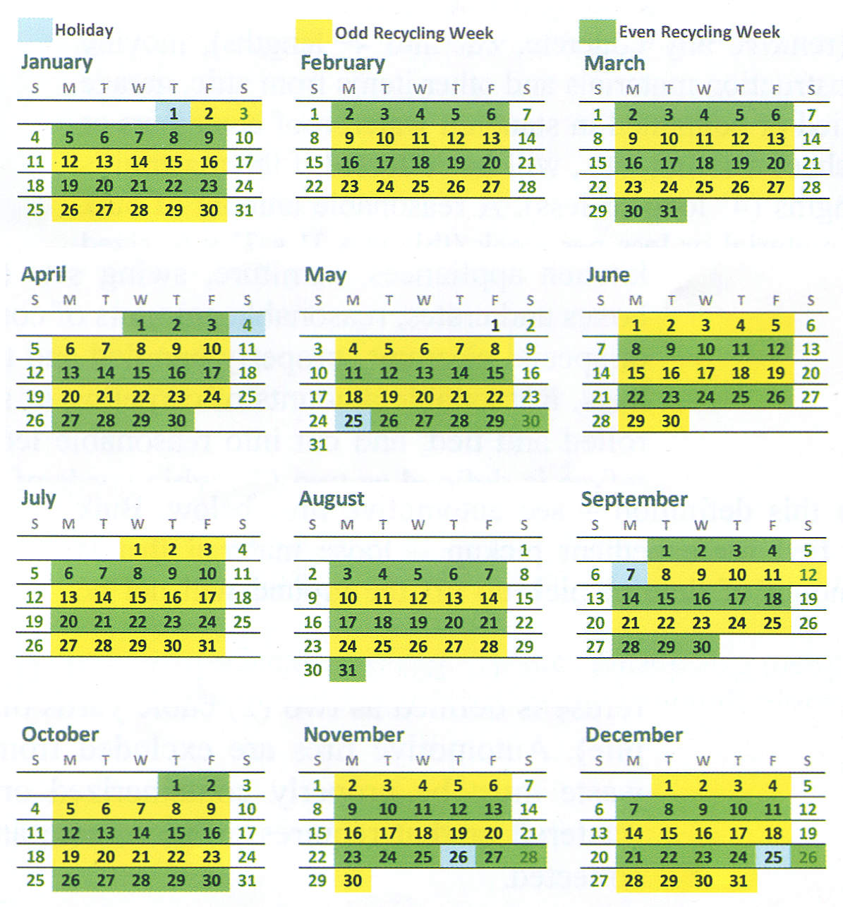 Waste Management empties our recycling totes every other week. For 2026, they provided the calendar shown here, and will collect our recycling only on EVEN weeks (shown here in GREEN):